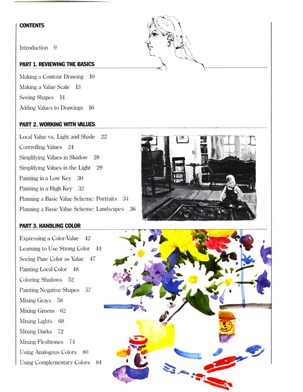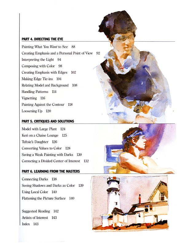 The book include basic lessons on drawing, values, color and composition. It also includes tips on washes, subtle colors mixes and flesh tones, paint lights and shadows, uses of edges to direct the audience's eye, subject integration with the background, how to loosen and liven up your painting; and much more. A huge pack of 46 lessons.